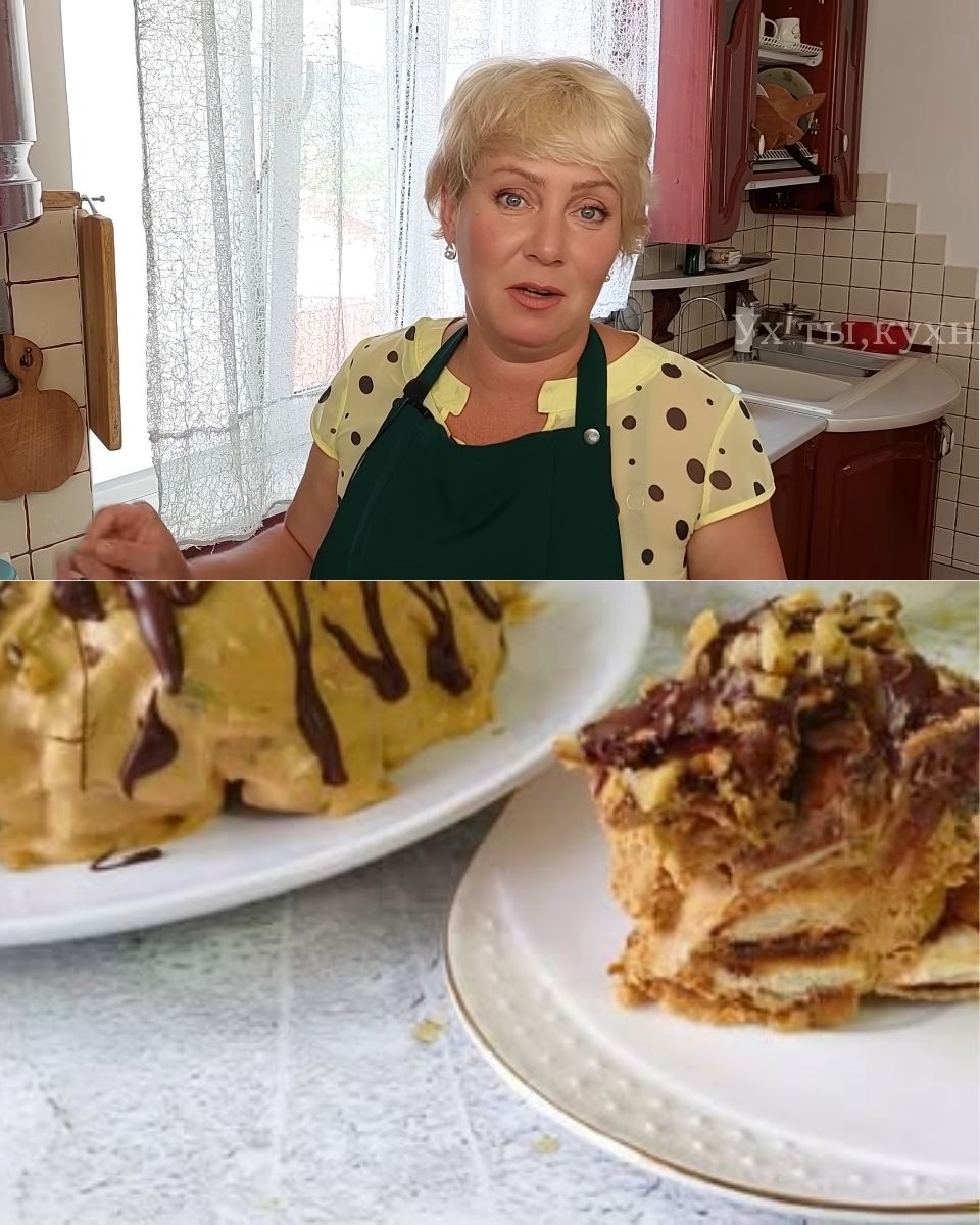 Выложить крем с коржами на тарелку, сформировав горку. Убрать торт в холодильник для пропитки на 8-10 часов.
