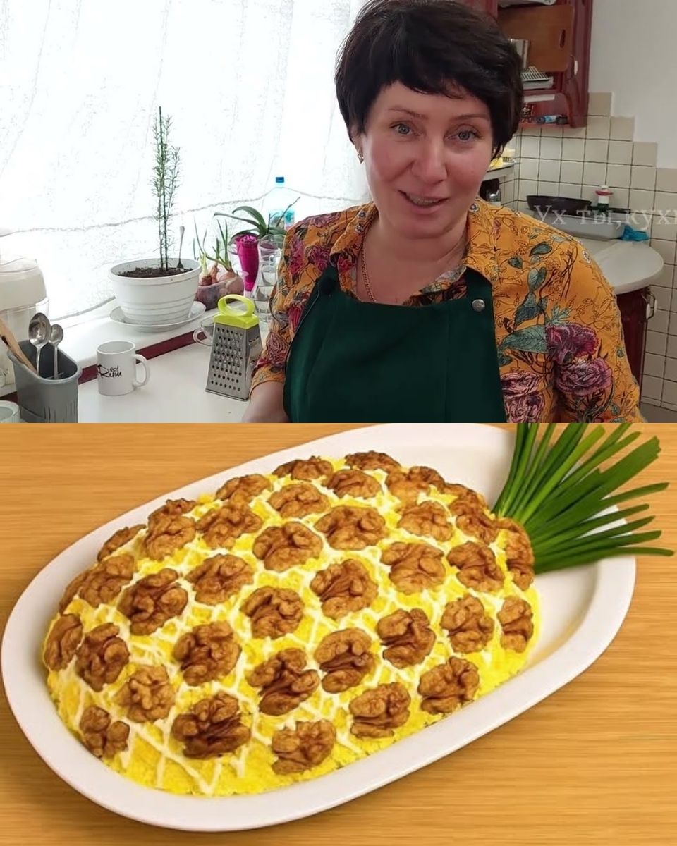 На пергаментний папір натираємо охолоджене тісто на великій тертці й рівномірно розподіляємо його. - Викладаємо збиті білки (крем) поверх тіста, формуючи гарний шар. Посипаємо волоськими горіхами.