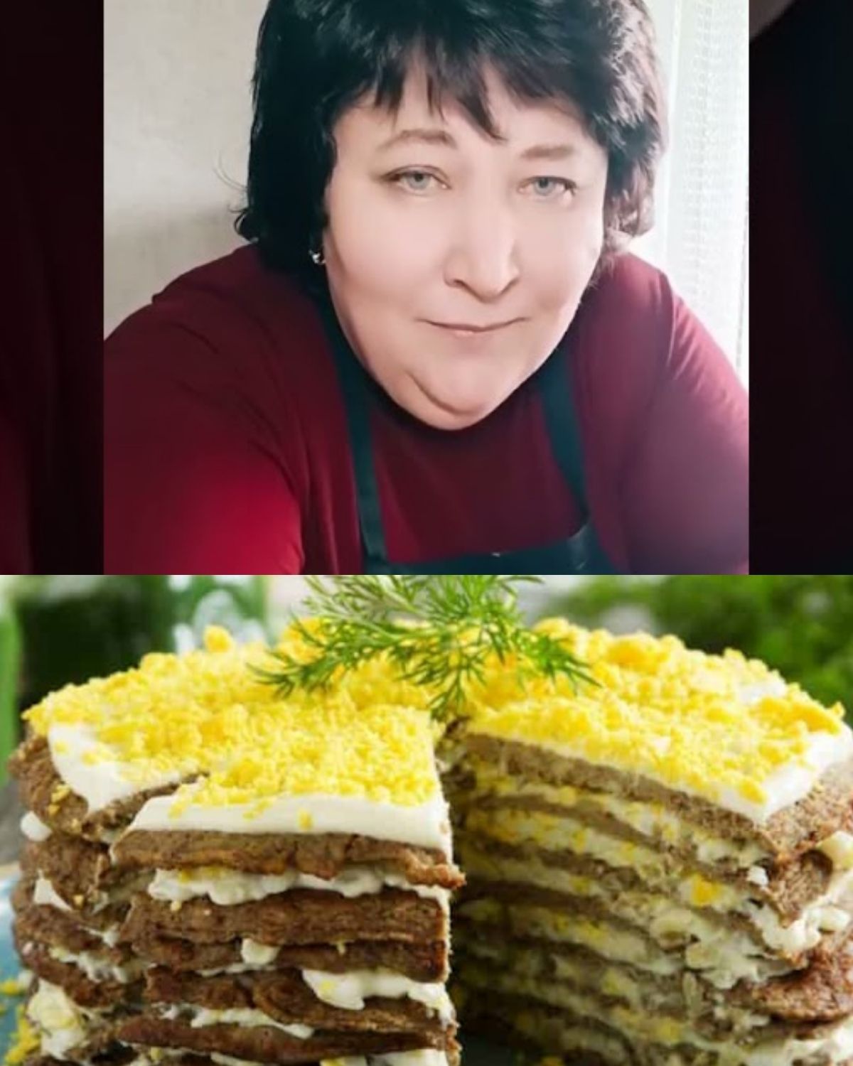 В это время сделайте крем. Творожный сыр соедините с йогуртом и чесноком, размешайте. Готовый корж извлеките из духовки, подождите пока чуть остынет. Смажьте кремом. Разрежьте пополам и накройте одним кусочком другой. Выровняйте края и снова разделите пополам. Выложите друг на друга и разрежьте поперек на порционные куски.